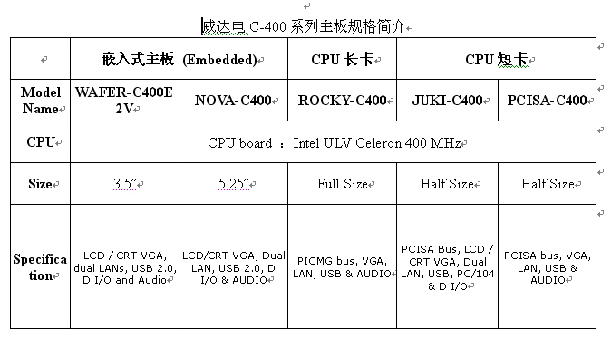 IEIC-400係列包含嵌入式主板、以及CPU長卡、短卡等五款新產品。在嵌入式係統領域中,IEI一直是各應用領域的最佳夥伴,此次推出C400嵌入式主板兩款,分別為5.25吋的NOVA係列及3.5吋的WAFER係列。CPU長卡則為PICMG接口功能齊全,可以支持十數張的適配卡同時工作,也不會影響其原來具備的高效能與應用能力。 CPU短卡則是結合PCI接口及ISA接口的PCISA接口CPU卡,能夠支持更多應用組合。