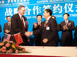 本次國際合作項目的簽約,得到了省市政府的高度重視,儀式開始前20分鍾黑龍江省副省長王利民、哈爾濱市副市長王世華與羅克韋爾代表團親切會昭,並在本次簽約儀式上致賀辭。