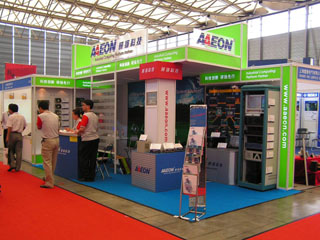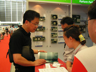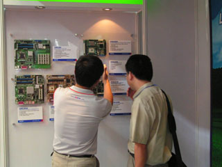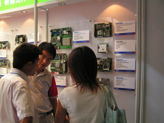 展位左側陳列的板卡中,FWB-880是防火牆家族的新成員,支持Intel® Pentium® 4/ 賽揚D CPU。在展位最醒目位置的立柱上有液晶屏做動態演示,控製它的是擺放在立柱下方的我們目前正在促銷的壁掛式工業係統——AMC-250。正如大家看到的,它結構小巧、簡單,CPU無風扇設計,壽命更長,是工廠自動化等領域的最佳選擇。