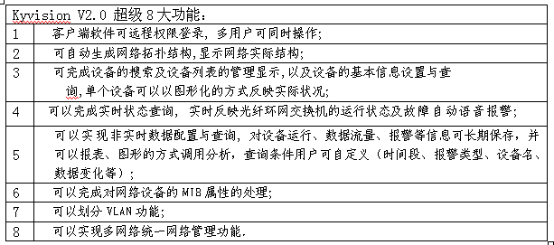 專用網管軟件Kyvision V2.0界麵友好,使用方便,根據產品類型或功能將分多個產品類型。簡單描述則有以下8大功能: