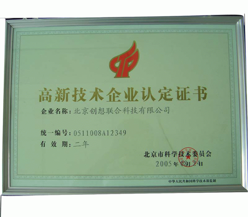 2005年8月24日ri,北bei京jing創chuang想xiang聯lian合he科ke技ji有you限xian公gong司si被bei北bei京jing市shi科ke學xue技ji術shu委wei員yuan會hui認ren定ding為wei高gao新xin技ji術shu企qi業ye。我wo公gong司si將jiang繼ji續xu憑ping借jie自zi己ji的de研yan發fa優you勢shi為wei工gong控kong行xing業ye開kai發fa出chu更geng多duo具ju有you自zi己ji特te色se產chan品pin為wei客ke戶hu服fu務wu。