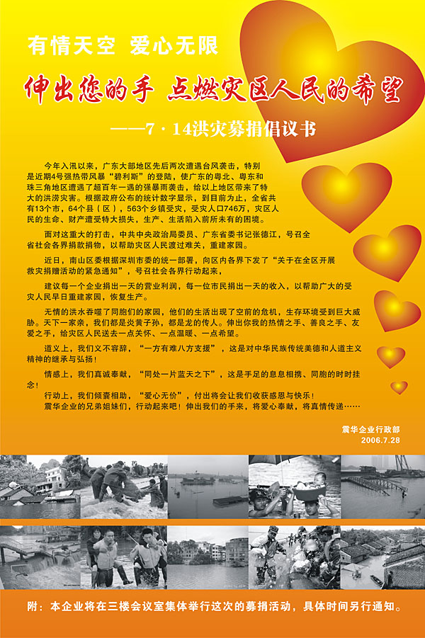 2006年8月3日上午,深圳市震華高新電子有限公司響應廣東省政府的號召進行了名為“有情天空,愛心無限——伸出您的手 點燃災區人民的希望”的救災捐款活動,幫助災區人民重建家園。集團公司(包括震華電子、中華工控網、天華數字電視、藝華衛視、震華信息)的全體職員參加此次捐助活動。