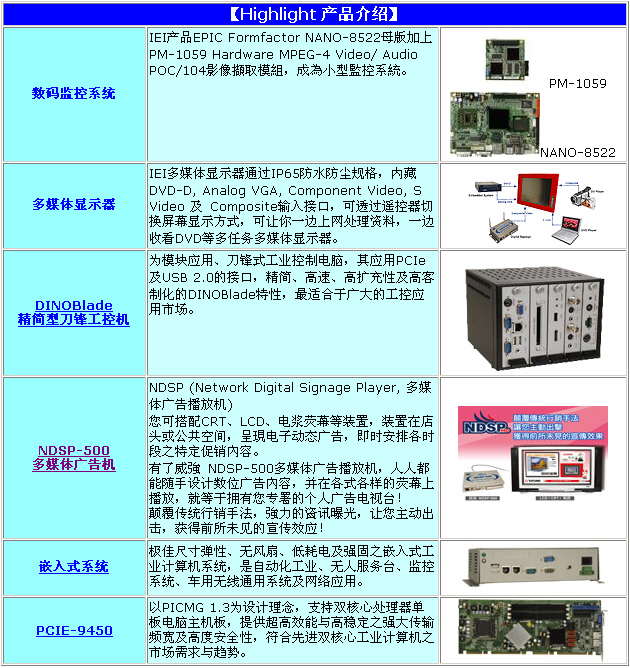 此次威強在2006中國(北京)國際網絡安全技術與應用展覽會裏將展出展示安防監控係統外同時展示符合歐盟RoHS指令之最新單板計算機及嵌入式主板、電源模塊、以及通過IP65認證的工作站電腦、平板電腦、醫療應用平板電腦、在係統方麵同時也展出嵌入式係統、特別是今年度才推出最先進的多媒體廣告播放機NDSP-500,多(duo)媒(mei)體(ti)顯(xian)示(shi)器(qi)等(deng),來(lai)到(dao)威(wei)強(qiang)的(de)攤(tan)位(wei)走(zou)一(yi)遭(zao)您(nin)將(jiang)有(you)機(ji)會(hui)第(di)一(yi)時(shi)間(jian)接(jie)觸(chu)威(wei)強(qiang)最(zui)新(xin)工(gong)業(ye)等(deng)級(ji)解(jie)決(jue)方(fang)案(an),並(bing)與(yu)威(wei)強(qiang)產(chan)品(pin)專(zhuan)家(jia)交(jiao)換(huan)心(xin)得(de),讓(rang)威(wei)強(qiang)不(bu)斷(duan)的(de)創(chuang)新(xin)的(de)產(chan)品(pin)與(yu)貼(tie)心(xin)OEM/ODM的服務內容,引領您進入工業電腦包羅萬象的應用範例。