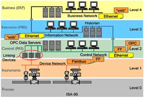 現場總線屬於設備級的網絡,用一根通信電纜就可以解決供電、本安、多節點連接和連接距離的問題。以太網是控製係統的骨幹網,它傳輸速率高、可承載多種應用協議,傳輸路徑可利用路由器加以選擇,必要時可采用全冗餘的網絡結構。不同的工業以太網設備之間利用OPC來交換數據。在生產執行層(MES)和經營管理層(ERP)同樣運用以太網網絡。這就構成了如圖5 所示的係統結構圖,圖中還給出了不同的網絡介質和網絡協議。