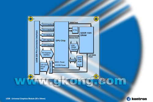 為了免除上述兩種可能的情況,控創科技(Kontron)與圖誠科技(XGI)首次合作推出“嵌入式影像模組” (Universal Graphics Module, UGM), UGM是一款大小為84 x 95 mm的嵌入式影像模組,不同於一般傳統顯示卡需以90度垂直安裝的方式,嵌入式影像模組是以平行方式插入底板上以節省空間,更重要的是UGM嵌入式影像模組至少能提供3到5年的長期供貨性,快速且容易的導入客製化的硬體設計,當然也包括必要及耗時的驅動程式。透過COM Express的220接腳,UGM可經由1、4、8或16通道(PEG)來接收PCI-Express信號、視訊信號並且進行處理,包括視訊截取功能以及高達1GB DRAM記憶體,隨後亦透過該連接器把經轉換信號遞送回到底板上。對播放來源來說,UGM 1.0 規格目前支援雙LVDS、雙DVI以及雙VGA的撥放方式。