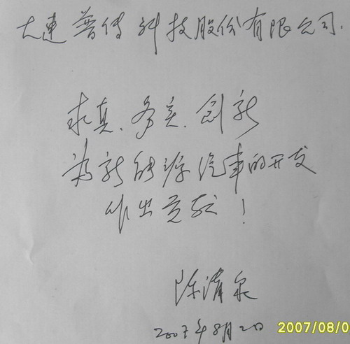 2007年8月3日,2007混合動力汽車控製技術研討會第二次會議哈爾濱召開,參會期間,全國政協委員、國際電動車領域權威專家陳清泉院士聽了普傳科技關於混合動力汽車關鍵部件電機及控製器的技術和產業化發展介紹後欣然題詞:“求真、務實、創新,為我國新能源汽車發展做貢獻”。