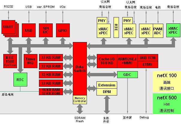 新一代工業網絡控製芯片netX支持幾乎所有的主流工業網絡通訊技術,從現場總線到實時工業以太網:Profibus、CANopen、DeviceNet、InterBus、AS-Interface、PROFINET、EtherCAT、EtherNet/IP、SERCOS III、Powerlink等。netX既可以作為通訊接口,又可以作為一個單片係統,為集成各種各樣的現場總線和實時工業以太網通訊提供了無可比擬的靈活性。netX其最優的硬件設計,不僅是條形碼、識別係統、智能I/O、低成本驅動器、可編程邏輯控製器和終端設備的統一平台,而且為用戶開發自己的通訊協議及應用提供了統一平台。