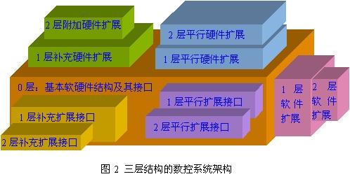 如圖2所示,層次化的數控係統具備一個基本的0層,它包括係統基本控製功能所需的所有組件以及滿足一般功能擴展必需的軟硬件接口,0層(ceng)作(zuo)為(wei)係(xi)統(tong)的(de)核(he)心(xin)結(jie)構(gou)必(bi)須(xu)具(ju)備(bei)良(liang)好(hao)的(de)對(dui)內(nei)和(he)對(dui)外(wai)接(jie)口(kou),對(dui)內(nei)部(bu)既(ji)要(yao)保(bao)證(zheng)組(zu)件(jian)之(zhi)間(jian)相(xiang)互(hu)通(tong)訊(xun)和(he)訪(fang)問(wen)的(de)暢(chang)通(tong),又(you)要(yao)保(bao)證(zheng)內(nei)部(bu)結(jie)構(gou)的(de)細(xi)節(jie)屏(ping)蔽(bi),實(shi)現(xian)整(zheng)個(ge)係(xi)統(tong)保(bao)持(chi)穩(wen)定(ding)性(xing)和(he)安(an)全(quan)性(xing)。0層以上的附加層建立在0層的擴展接口上,通過補充硬件和開放軟件接口來擴展係統的功能和提升控製的性能。