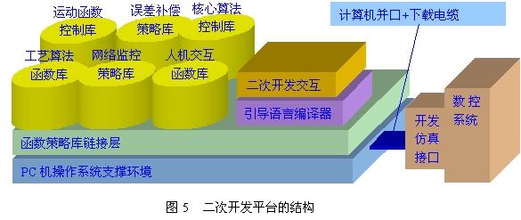 如圖5所(suo)示(shi)的(de)二(er)次(ci)開(kai)發(fa)平(ping)台(tai)模(mo)型(xing),我(wo)們(men)采(cai)用(yong)一(yi)種(zhong)引(yin)導(dao)開(kai)發(fa)的(de)模(mo)式(shi),借(jie)助(zhu)於(yu)預(yu)先(xian)定(ding)義(yi)的(de)各(ge)種(zhong)信(xin)息(xi)庫(ku),將(jiang)使(shi)用(yong)特(te)殊(shu)語(yu)言(yan)描(miao)述(shu)的(de)用(yong)戶(hu)功(gong)能(neng)要(yao)求(qiu)轉(zhuan)換(huan)成(cheng)信(xin)息(xi)庫(ku)中(zhong)特(te)定(ding)策(ce)略(lve)的(de)組(zu)合(he),然(ran)後(hou)通(tong)過(guo)與(yu)數控係統微控製核心相匹配的代碼編譯器,將策略描述翻譯並通過計算機的並口經由下載電纜傳送至數控係統的仿真開發接口。數控係統內(nei)部(bu)存(cun)在(zai)一(yi)個(ge)與(yu)之(zhi)相(xiang)對(dui)應(ying)的(de)仿(fang)真(zhen)開(kai)發(fa)專(zhuan)門(men)存(cun)儲(chu)區(qu),用(yong)於(yu)用(yong)戶(hu)訂(ding)製(zhi)功(gong)能(neng)代(dai)碼(ma)的(de)在(zai)線(xian)校(xiao)驗(yan),該(gai)存(cun)儲(chu)區(qu)與(yu)正(zheng)常(chang)數(shu)控(kong)程(cheng)序(xu)存(cun)儲(chu)區(qu)相(xiang)互(hu)屏(ping)蔽(bi),保(bao)證(zheng)二(er)次(ci)開(kai)發(fa)的(de)安(an)全(quan)性(xing),並(bing)通(tong)過(guo)校(xiao)驗(yan)策(ce)略(lve)和(he)評(ping)價(jia)機(ji)製(zhi)返(fan)回(hui)二(er)次(ci)開(kai)發(fa)的(de)性(xing)能(neng)指(zhi)標(biao)。