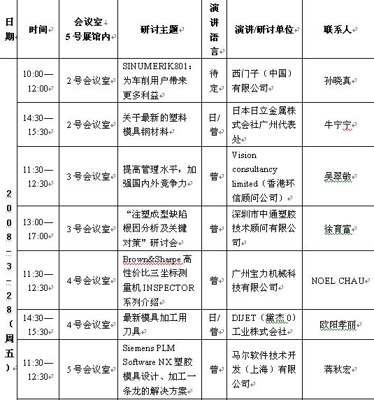 2008年3月28-31日展覽會,展覽會期間展覽會組織機構將聯合業界知名機構舉辦“節能降耗專場論壇”、“2008第三屆國際金屬加工刀具應用技術論壇”等專業高峰論壇和數十場專題技術研討會、講座。具體計劃如下: