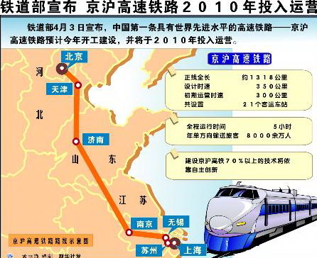 世界上一次建成線路最長、標準最高的高速鐵路——京滬高速鐵路18日全麵開工建設。這條高速鐵路將由中國自主建設,連接北京和上海兩個中國經濟規模最大的直轄市。計劃5年後建成,屆時輸送能力將達到單向每年8000萬人次,時間將由現在的約10小時縮短到5小時。