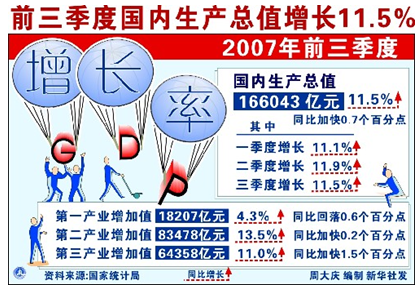 謝伏瞻昨天在清華大學做題為“十七大後中國經濟發展的前景”的報告時表示,從2002年到2007年的5年中,GDP的年增長率都保持在10%左右。