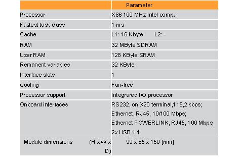 控製器。適用於中小型機械設備的控製,或者是流程控製中從站控製。X20CP1483采用Intel Ceron Comp. 100MHz處理器,任務周期為1ms,詳細技術參數如下: