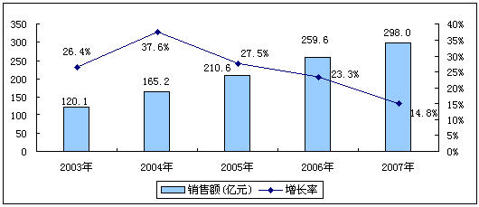 圖1 2003-2007年中國電源管理芯片市場規模及增長
