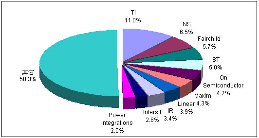 目(mu)前(qian)中(zhong)國(guo)電(dian)源(yuan)管(guan)理(li)芯(xin)片(pian)市(shi)場(chang)的(de)品(pin)牌(pai)構(gou)成(cheng)仍(reng)是(shi)國(guo)外(wai)廠(chang)商(shang)處(chu)於(yu)領(ling)先(xian)地(di)位(wei),市(shi)場(chang)排(pai)名(ming)前(qian)十(shi)的(de)企(qi)業(ye)無(wu)一(yi)例(li)外(wai)全(quan)部(bu)為(wei)外(wai)資(zi)企(qi)業(ye),其(qi)中(zhong)美(mei)國(guo)廠(chang)商(shang)優(you)勢(shi)明(ming)顯(xian)。然(ran)而(er),電(dian)源(yuan)管(guan)理(li)芯(xin)片(pian)市(shi)場(chang)的(de)品(pin)牌(pai)集(ji)中(zhong)度(du)在(zai)緩(huan)慢(man)下(xia)降(jiang),2007年市場上排名前十位廠商所占的份額在2006年的基礎上進一步下降,前十名所占的市場份額已經不足50%,說(shuo)明(ming)市(shi)場(chang)競(jing)爭(zheng)進(jin)一(yi)步(bu)加(jia)劇(ju)。而(er)且(qie),隨(sui)著(zhe)中(zhong)國(guo)台(tai)灣(wan)和(he)中(zhong)國(guo)本(ben)土(tu)廠(chang)商(shang)在(zai)電(dian)源(yuan)管(guan)理(li)領(ling)域(yu)的(de)進(jin)一(yi)步(bu)開(kai)拓(tuo),這(zhe)種(zhong)趨(qu)勢(shi)未(wei)來(lai)還(hai)將(jiang)繼(ji)續(xu),而(er)且(qie)隨(sui)著(zhe)中(zhong)低(di)端(duan)電(dian)源(yuan)管(guan)理(li)產(chan)品(pin)競(jing)爭(zheng)廠(chang)商(shang)的(de)增(zeng)加(jia)以(yi)及(ji)產(chan)品(pin)材(cai)料(liao)成(cheng)本(ben)的(de)不(bu)斷(duan)增(zeng)加(jia),產(chan)品(pin)利(li)潤(run)空(kong)間(jian)被(bei)不(bu)斷(duan)壓(ya)縮(suo),這(zhe)些(xie)國(guo)際(ji)領(ling)先(xian)廠(chang)商(shang)未(wei)來(lai)有(you)可(ke)能(neng)會(hui)放(fang)棄(qi)部(bu)分(fen)低(di)端(duan)的(de)微(wei)利(li)產(chan)品(pin)業(ye)務(wu),電(dian)源(yuan)管(guan)理(li)芯(xin)片(pian)市(shi)場(chang)品(pin)牌(pai)集(ji)中(zhong)度(du)下(xia)降(jiang)的(de)趨(qu)勢(shi)未(wei)來(lai)幾(ji)年(nian)還(hai)將(jiang)延(yan)續(xu)。