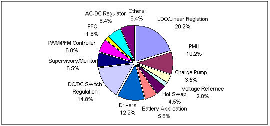 消費、網絡通信和計算機一直是電源管理芯片市場最主要的應用領域,三大領域依然占據了中國電源管理芯片市場近80%的市場份額。從發展速度來看,計算機領域是2007年(nian)增(zeng)長(chang)速(su)度(du)最(zui)慢(man)的(de)領(ling)域(yu),整(zheng)機(ji)產(chan)量(liang)的(de)下(xia)降(jiang)是(shi)直(zhi)接(jie)原(yuan)因(yin),雖(sui)然(ran)筆(bi)記(ji)本(ben)電(dian)腦(nao)依(yi)然(ran)保(bao)持(chi)了(le)高(gao)增(zeng)長(chang)率(lv),但(dan)是(shi),其(qi)它(ta)產(chan)品(pin)增(zeng)長(chang)率(lv)都(dou)有(you)較(jiao)大(da)程(cheng)度(du)的(de)放(fang)緩(huan),有(you)的(de)產(chan)品(pin)產(chan)量(liang)甚(shen)至(zhi)出(chu)現(xian)下(xia)滑(hua)。2007年市場最大的亮點在於汽車電子類電源管理芯片市場取得了超過40%的高增長率,雖然電源管理芯片市場2007niandefazhanyousuojianhuan,danshizaigezhongqichedianzizhengjichanliangkuaisuzengchangdedaidongxia,gailingyudedianyuanguanlixinpianshichangchixulejinnianlaidegaozengchanglv。ranerhaiyinggaikandaodeshi,yongyuqichedianzilingyudedianyuanguanlixinpiansuozhandefenejiaoxiao,qigaosuzengchangwufadaidongdianyuanguanlixinpianzhengtishichangdezengchang。