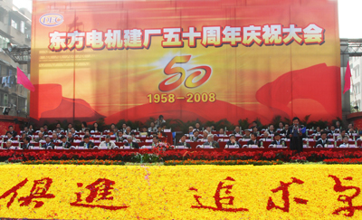 第十屆全國政協副主席李蒙、四川省政協主席陶武先,四川省委常委、省國資委黨委書記王少雄,原國家機械工業部副部長陸燕蓀,機械工業聯合會副會長、中銀香港副董事長孫昌基,原省委常委、成都市委書記、原東方電機廠黨委書記兼紀委書記王楓,原省委常委、省紀委書記、省重大裝備領導小組組長沈國俊,德陽市市委書記、市人大常委會主任方小方,德陽市代市長陳新有,中國廣東核電集團有限公司總工程師樊鶴鳴,哈爾濱電機廠有限公司副董事長、黨委書記宋世麒,集團公司黨組書記、董事長王計,黨組副書記、總經理斯澤夫,集團公司黨組成員、東方電氣股份有限公司總裁溫樞剛,集團公司黨組成員、東方電氣股份有限公司高級副總裁朱元巢,集團公司總法律顧問、東方電氣股份有限公司董事張繼烈,東方電氣股份有限公司副總裁、東方電機總經理韓誌橋,東方電氣股份有限公司副總裁、東方汽輪機總經理張誌英,東方電氣股份有限公司總會計師龔丹,東方電氣股份有限公司總裁助理、核電事業部總經理高峰,集團公司黨組工作部部長劉輝,東方電機部分老領導孫昌百、鄧毅生、袁長河、陳衛建等和東方電機的幹部職工在東方電機體育場歡聚一堂,共同慶祝東方電機五十年華誕。