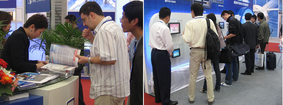 威綸通在E1國際館的特裝展台上,全麵展示了最新推出的目前業內速度最快的觸摸屏MT8000X,寬屏MT6070T、MT8070T,以及經濟型人機界麵MT6000T係列,中高端人機界麵MT8000T係列,豐富的產品線涵蓋了工控自動化中低端、高端客戶的個性化需求,風能、軌道交通、建築節能、機械製造等行業的成功應用吸引了與會者的廣泛關注!