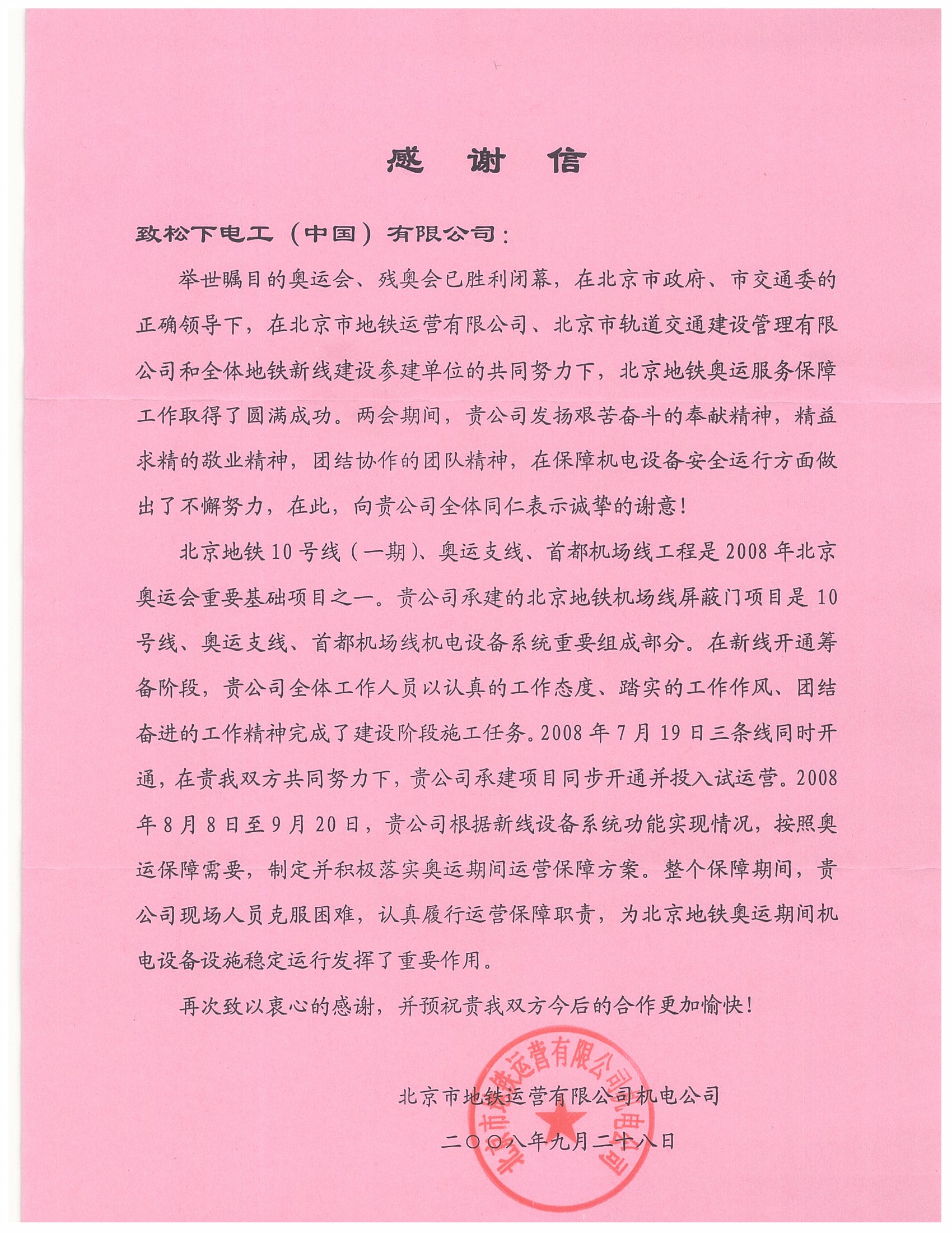 9月28日,鬆下電工(中國)有限公司軌道交通事業推進部獲得了北京市地鐵運營有限公司機電公司的感謝信,感謝Panasonic所有員工為奧運期間“國門第一線”首都機場快線的地鐵屏蔽門(安全門)安全運營做的貢獻。