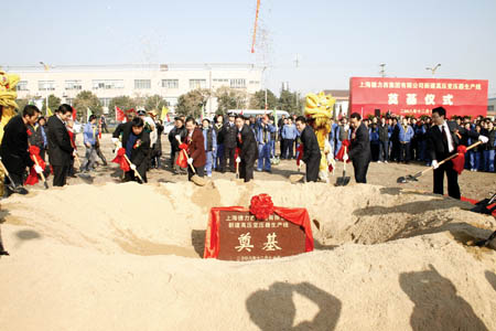 在轟鳴的鞭炮聲和悅耳的鼓樂聲中,各級領導為變壓器生產線奠基培土。
