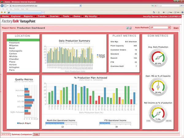 由羅克韋爾自動化發布的羅克韋爾軟件FactoryTalk VantagePoint,對其FactoryTalk集成化生產與績效套件的具有創新性的補充,使最終用戶能夠自己來配置豐富的基於網頁的儀表板、趨勢以及報告,而無須昂貴且耗時的支持資源。羅克韋爾自動化在2008年4月收購了Incuity軟件公司來作為其擴展FactoryTalk®集成化生產與績效套件所做努力的一部分。作為業界領先的企業級製造業智能(EMI)軟件供應商,Incuity公司為商業決策支持提供實時智能,從而改善操作並減少生產浪費。通過此次對Incuity公司的收購,不僅使 FactoryTalk VantagePoint 軟件提升了Factorytalk麵向服務的架構,也實現了通過連結羅克韋爾自動化以及第三方係統更加簡易有效的獲取寶貴的生產信息。
