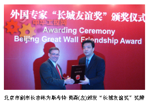 編者語:2月17日, 北京市人民政府今天授予羅斯蒙特亞太區運營副總裁、艾默生(北京)儀表有限公司總經理斯考特·奧森(Scott Olson)北京市2008年度外國專家 “長城友誼獎”。