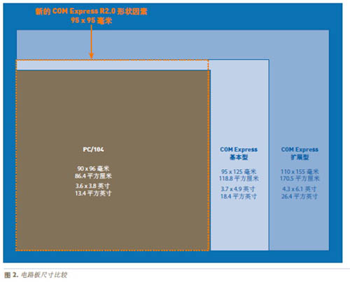 PC/104-Express 和 COM EXPRESS的開放式標準規格定義了很多設計要求,例如電路板尺寸、連接器信號排列和堆疊。圖 2 說明了電路板尺寸,顯示 PC/104-Express 的一種選項和 COM Express 的三種選項,包括在 COM.0 R2.0 中定義的新的 95 x 95mm 緊湊型版本,預計該版本將在 2010 年獲得批準。