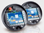具有安全功能的移動麵板 277 IWLAN 擁有兩個帶有三個切換位置的使能按鈕(緊急製動開關)和一個急停按鈕
