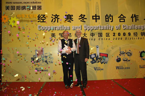 會議最後美國邦納全球副總裁Bob Schlicksup先生與大中華區董事總經理胡勇先生向在2008年(nian)取(qu)的(de)優(you)秀(xiu)業(ye)績(ji)的(de)經(jing)銷(xiao)商(shang)頒(ban)獎(jiang),現(xian)場(chang)氣(qi)氛(fen)達(da)到(dao)高(gao)潮(chao)。經(jing)銷(xiao)商(shang)們(men)和(he)邦(bang)納(na)高(gao)層(ceng)們(men)一(yi)致(zhi)堅(jian)信(xin)誰(shui)能(neng)先(xian)於(yu)用(yong)戶(hu)的(de)需(xu)求(qiu),更(geng)多(duo)地(di)以(yi)用(yong)戶(hu)的(de)應(ying)用(yong)出(chu)發(fa),推(tui)出(chu)更(geng)具(ju)競(jing)爭(zheng)力(li)的(de)解(jie)決(jue)方(fang)案(an),誰(shui)才(cai)是(shi)最(zui)具(ju)有(you)實(shi)力(li)的(de)公(gong)司(si),邦(bang)納(na)中(zhong)國(guo)的(de)願(yuan)景(jing)是(shi)要(yao)做(zuo)中(zhong)國(guo)最(zui)好(hao)的(de)傳(chuan)感(gan)器(qi)產(chan)品(pin)製(zhi)造(zao)商(shang)和(he)傳(chuan)感(gan)控(kong)製(zhi)方(fang)案(an)提(ti)供(gong)商(shang),通(tong)過(guo)邦(bang)納(na)公(gong)司(si)和(he)各(ge)經(jing)銷(xiao)商(shang)們(men)的(de)堅(jian)持(chi)不(bu)懈(xie)和(he)精(jing)誠(cheng)合(he)作(zuo),2009年邦納公司一定會戰勝經濟寒冬並取得更輝煌的增長。