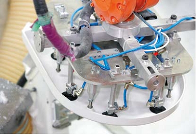 每隔140秒,8台脲醛注塑機自動輸入一次塑膠顆粒,馬桶座蓋即在400噸高壓和145℃高溫下生產出來,日產量高達2,000套。隨後,馬桶座由傳送帶分別送往8台ABB IRB 2400機器人所在的工位。配備高頻轉軸(44,000 rpm)的(de)機(ji)器(qi)人(ren)自(zi)動(dong)進(jin)行(xing)座(zuo)蓋(gai)邊(bian)緣(yuan)的(de)磨(mo)削(xue)和(he)去(qu)毛(mao)刺(ci),切(qie)除(chu)注(zhu)塑(su)件(jian)的(de)澆(jiao)口(kou),並(bing)為(wei)座(zuo)蓋(gai)加(jia)填(tian)緩(huan)衝(chong)墊(dian),確(que)保(bao)產(chan)品(pin)質(zhi)量(liang)的(de)高(gao)度(du)統(tong)一(yi)。馬(ma)桶(tong)座(zuo)經(jing)檢(jian)查(zha)和(he)終(zhong)調(tiao)後(hou),完(wan)成(cheng)成(cheng)品(pin)包(bao)裝(zhuang)。
