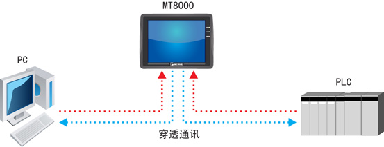 而且最重要的是,最新的EB8000V2.1.0版本軟件新增加了穿透通訊功能。安裝了EB8000V2.1.0版本軟件的MT8000T、MT8000X、MT8000i係列觸摸屏,允許PC上的應用程序透過HMI直接連接PLC。此時觸摸屏相當於一個數據轉接器,PC上的應用程序可以通過這個轉接器對PLC程序進行讀取、寫入;監控PLC的數據以及相關PLC調試。