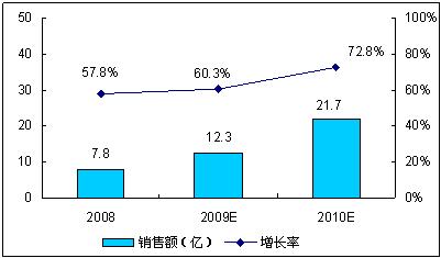 圖 2008-2010年中國超高頻RFID市場規模及增長率(按銷售額)