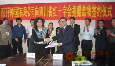 中國成都, 2009年5月7日(ri),西(xi)門(men)子(zi)與(yu)四(si)川(chuan)省(sheng)紅(hong)十(shi)字(zi)會(hui)簽(qian)署(shu)了(le)援(yuan)建(jian)四(si)川(chuan)省(sheng)崇(chong)州(zhou)市(shi)公(gong)議(yi)鄉(xiang)公(gong)立(li)衛(wei)生(sheng)院(yuan)的(de)捐(juan)贈(zeng)協(xie)議(yi),旨(zhi)在(zai)幫(bang)助(zhu)恢(hui)複(fu)和(he)改(gai)善(shan)公(gong)議(yi)鄉(xiang)受(shou)地(di)震(zhen)影(ying)響(xiang)的(de)醫(yi)療(liao)衛(wei)生(sheng)服(fu)務(wu)。西(xi)門(men)子(zi)此(ci)次(ci)捐(juan)贈(zeng)計(ji)330萬wan元yuan,包bao括kuo員yuan工gong捐juan款kuan及ji醫yi療liao設she備bei一yi批pi。此ci批pi物wu資zi將jiang用yong於yu新xin建jian衛wei生sheng院yuan住zhu院yuan部bu,同tong時shi翻fan修xiu衛wei生sheng院yuan嚴yan重zhong受shou損sun的de建jian築zhu並bing為wei其qi配pei備bei相xiang關guan醫yi療liao設she備bei。截jie至zhi目mu前qian,西xi門men子zi及ji員yuan工gong向xiang地di震zhen災zai區qu累lei計ji捐juan贈zeng已yi超chao過guo1700萬元。四川省成都市政協副主席戴曉雁先生、四川省紅十字會副會長張波女士、西門子(中國)有限公司高級副總裁兼南區總經理農克強先生以及西門子(中國)有限公司醫療業務領域副總裁曹永勝先生出席了捐贈儀式。