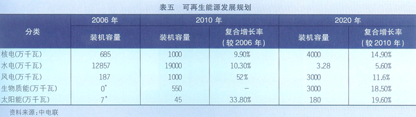 2008年3月《可再生能源發展“十一五”規劃》對該目標進行階段性目標的細化與調整,明確提出了至2020年我國可再生能源發展的指導思想、主要任務、發展目標、重點領域和保障措施。按照相關規劃,2010年,可再生能源占比達到10%,2020年達到16%,而目前這一比例尚不足1%。到2010年我國可再生能源年利用量將達到2.7億噸標準煤。其中,水電達到1.8億千瓦,風電超過500萬千瓦,生物質發電達到550萬千瓦,太陽能發電達到30萬千瓦。未來,我國電力裝機容量中,水電、核電、新能源的占比將上升。到2020年建成水電3億千瓦、風電3000萬千瓦、生物質發電3000萬千瓦、太陽能發電180萬千瓦、建成太陽能熱水器麵積3億平方米、沼氣年利用440億立方米、生物質成型燃料5000萬噸。積極發展非糧生物液體燃料,到2020年形成年替代1000萬噸石油的能力。規劃把“加大財政投入,實施稅收優惠政策”作為可再生能源開發利用的一項原則確定下來。