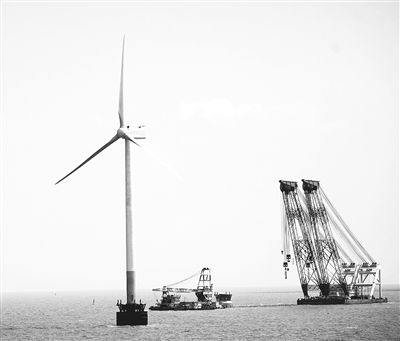 矗立在我國東海之上的90多米高的海上風電機。(資料照片)