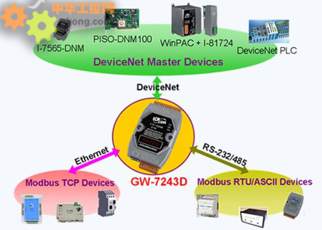 GW-7243D (DeviceNet轉Modbus TCP/RTU/ASCII網關) 是泓格新推出的工業用DeviceNet係列產品之一。GW-7243D多種優異的功能,能夠提供DeviceNet主端控製器與Modbus TCP/RTU/ASCII從端的設備同時交換數據。在DeviceNet網絡上,GW-7243D是一個“Group 2 Only Server”的設備。在Modbus網絡上,GW-7243D為主控端的設備,藉由內建的核心程序,GW-7243D會不斷的發送DeviceNet對象中所定義的Modbus命令與Modbus從端的設備相互通訊。此外,我們也提供了Utility工具軟件,讓用戶能快速容易的建構GW-7243D的各項參數、將Modbus命令規劃至適當的DeviceNet對象並產生EDS文件供DeviceNet主端應用程序使用。整合GW-7243D的應用, 您可以更容易的將Modbus設備擴充到DeviceNet的應用環境而不須煩惱界麵轉換的問題。