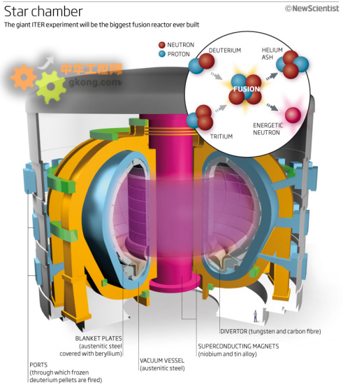 國際熱核實驗反應堆(ITER, International Thermonuclear Experimental Reactor)計劃也被稱為“人造太陽”計劃,由歐盟、中國、美國、日本、韓國、俄羅斯和印度等7方共同參與,與國際空間站、歐洲大型強子對撞機、人(ren)類(lei)基(ji)因(yin)組(zu)計(ji)劃(hua)一(yi)樣(yang),是(shi)一(yi)個(ge)龐(pang)大(da)的(de)國(guo)際(ji)科(ke)技(ji)合(he)作(zuo)項(xiang)目(mu),需(xu)要(yao)多(duo)國(guo)科(ke)學(xue)家(jia)合(he)作(zuo)才(cai)能(neng)完(wan)成(cheng)。其(qi)目(mu)的(de)是(shi)借(jie)助(zhu)氫(qing)同(tong)位(wei)素(su)在(zai)高(gao)溫(wen)下(xia)發(fa)生(sheng)核(he)聚(ju)變(bian)來(lai)獲(huo)取(qu)豐(feng)富(fu)的(de)能(neng)源(yuan)。其(qi)原(yuan)理(li)類(lei)似(si)太(tai)陽(yang)發(fa)光(guang)發(fa)熱(re),即(ji)在(zai)上(shang)億(yi)攝(she)氏(shi)度(du)的(de)超(chao)高(gao)溫(wen)條(tiao)件(jian)下(xia),利(li)用(yong)氘(dao)、chuandejubianfanyingshifangchuheneng。hejubianranliaodaohechuankeyiconghaishuizhongtiqu,hejubianfanyingbuchanshengwenshiqitijihefeiliao。youyuyuanliaoquzhibujin,buhuiweihaihuanjing,zheyijihuadeshishijieguojiangjuedingrenleinengfouxunsudi、大規模地使用核聚變能,從而可能影響人類從根本上解決能源問題的進程,因此,意義和影響十分重大。