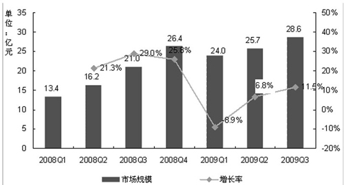 2009年第三季度中國RFID市場收入規模達到 28.6億元,環比增長11.5%,同比增長36.5%。