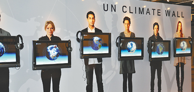 在丹麥首都哥本哈根貝拉會展中心布置的“聯合國氣候牆”。