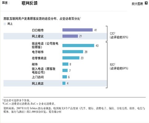 這些經驗中,有一部分來自參與式傳媒。我們的研究表明,在今天的西歐,有25%的互聯網用戶在網上發表對各種消費產品的評論和看法(圖)。用戶原創型媒體網站的訪問者和參與者每年增加100%,而傳統網站的增長率可能隻有20%至30%。