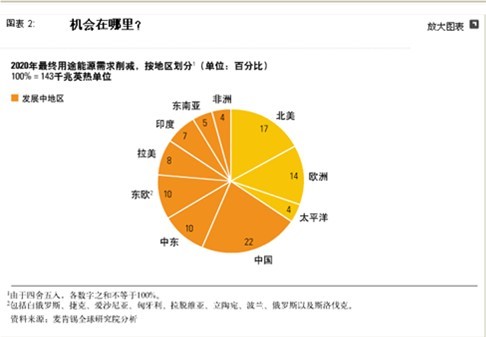 某些現有節能技術可通過未來節約的能源收回成本,僅靠應用這些技術,到2020年,消費者和企業即可節約6,000億美元。在本土市場率先重視提高能源效率的公司將占據優勢地位,它們將在全球 “綠色”產品和服務市場尚未成熟時就執得牛耳。實際上,在既能提高能源生產率又能帶來投資回報的機會中,有65%存在於發展中地區(圖表2)。