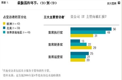 在我們的調查中,71%的歐洲 IT和業務高管表示,IT 必須與業務戰略緊密結合,但僅27%的高管認為,其企業真正做到了這一點。此外,在歐洲地區,向首席執行官彙報的首席信息官少於其他地區(圖表1):例如,歐洲有31%的首席信息官向首席執行官彙報,在北美,這一數據則為56%6。這一結果表明,歐洲企業仍然認為 IT 主管們應專注於後台運營,而不應把精力放在企業戰略和增長上。