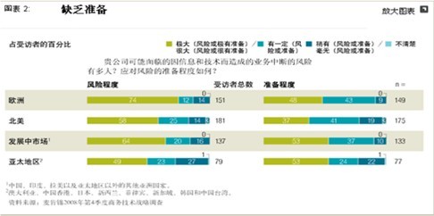 在接受調查的歐洲 IT和業務高管中,有74%(這一比例高於其他地區)認為,他們的公司非常或極有可能遭受由 IT 導致的業務中斷(圖表2),但僅有48%認為,他們的公司已經做好“非常”或“極其”充分的準備。說到 IT 能力可以改變競爭形勢,一些企業尚未意識到技術能夠幫助其取得成功:接受調查的歐洲 IT和業務高管有1/3並未將 IT 列入創造競爭優勢的三大杠杆之中。