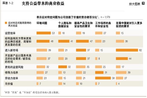 zaiquniandetiaozhazhong,gaoguanmendiyicigengqingxiangyujiangyingduishehuizhengzhiwentikanzuojiyuerfeifengxian,jinguannacitiaozhashizaijiuyuezhongxunjinxing,qiafengjinrongweijikaishixijuanquanqiu。2009年的調查結果支持了他們的這種觀點:zaishedinglemingquedeshehuizhengzhishiwushangyemubiaodeqiyezhong,gaoguanmenfanying,tamenhuodelegezhongshangyeshouyi,baokuojinruxinshichangheyihuogaijindeyunyingxiaolvjilaodonglixiaolvdeng。jutihuodehezhongshangyeshouyi,qujueyuyingduideshinazhongshehuizhengzhiwenti。liru,87%的受訪者說,他們的公司在應對環境問題(圖表1-1),他們中有53%的人提到運營效率提高、48%的人提到品牌忠誠度提高,39%的人提到進入新市場(圖表1-2)。相比之下,85%的受訪者反映,他們的公司在應對隱私權和數據安全性方麵的問題,他們中報告因此而獲得商業收益者較前者明顯減少。