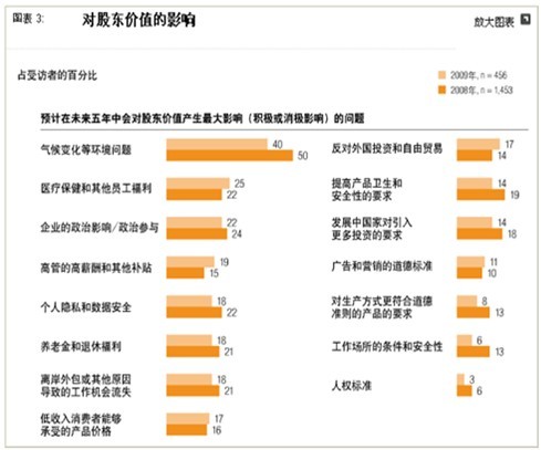 事實上,在高管們認為最受公眾關注的問題中,高管薪酬從2007年和2008年的第八位迅速竄升至第二位,而正是這個問題嚴重削弱了公眾對企業的信任3。此外,雖然環境問題繼續保持在第一位,但選擇這個問題的高管比例從2008年的57%下降到今年的49%4。