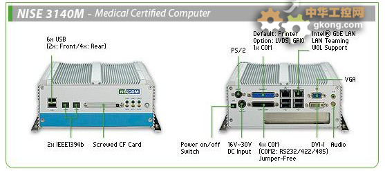 為提升應用靈活性,NISE 3140 無風扇工業計算機提供多種I/O接口,包括2 X 千兆網接口,4x 串口,6x USB接口, 1x VGA, 1x DVI-I,音頻接口,PCI或PCIe x1擴展接口,同時提供16V ~ 30V DC寬範圍的電源輸入。在工業自動化應用中,CF卡和可選的IEEE1394b接口是專為便利連接和使用而設計的。