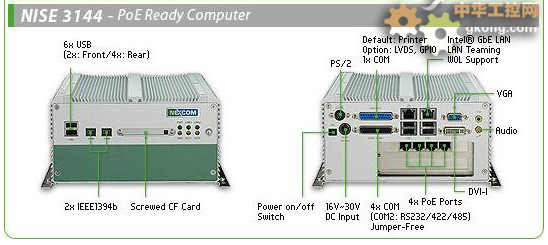 此外,標準NISE 3140 無風扇工業計算機平台在垂直行業應用中劃分出2個不同型號。如在醫療行業, NISE 3140M 無風扇工業計算機增加了EN60601認證,是多種醫療設備應用的理想選擇,如圖像處理和視覺偵測。其次,新漢推出的NISE 3144 無風扇工業計算機,基於Core™ 2 Duo架構的無風扇係統,定位在 PoE/mobile DVR應用。NISE 3144無風扇工業計算機為PoE係統提供4x PoE接口,最大可支持15.4W,100米距離。這意味著功率在Class 3 的PoE設備,如VoIP, IP照相機, 無線AP或RFID讀卡器可以通過NISE 3144連接(或動力驅動) – 是電力資源困難或難以到達的戶外或車載應用的理想選擇。