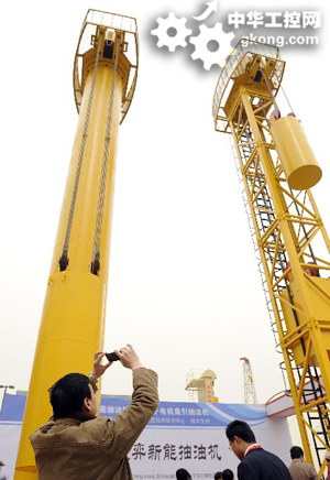 3月22日,一位觀眾在拍攝“綠色抽油機”,該抽油機采用低轉速大扭矩永磁電機作為動力係統,可節能40% 新華社圖片