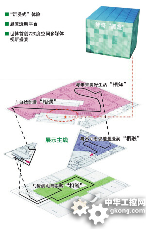 整個展館全麵貫穿了“以人為本、綠色環保”的理念,共設置了四個展區,分別為自然能量區、未來智能生活區、“魔盒”主展區、地下綠色智能電網展區。參觀者來到這裏,將通過一次奇妙的發現之旅,體驗未來自然、人、社會和諧共生的關係。