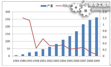 圖:1983-2009年中國電梯產量以及同比變化(單位:千台)